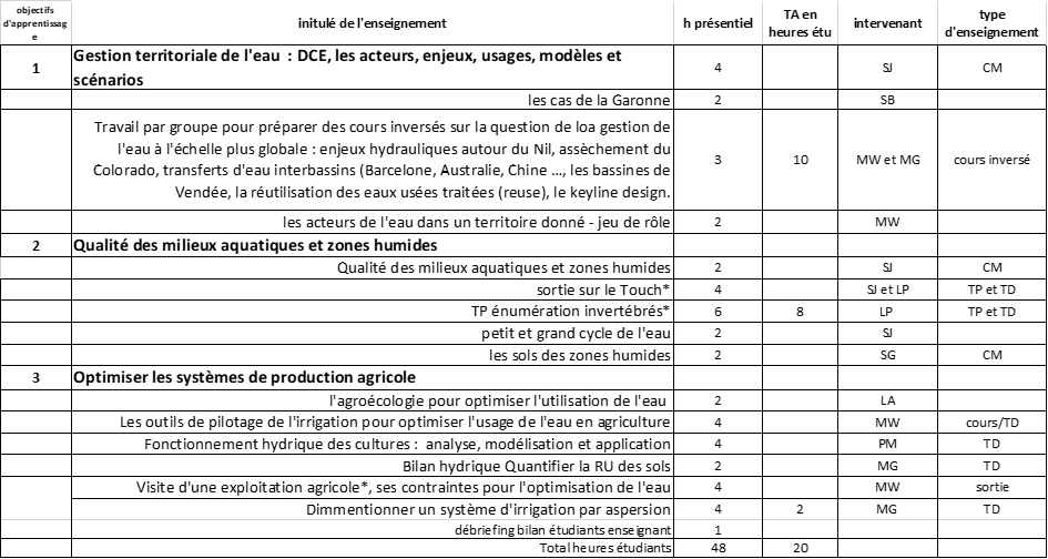 - Lors de CM et de TD/TP, les apprenants étudieront les systèmes d’exploitation agricoles plus économes en eau, suivront l’évolution du fonctionnement des couverts, calculeront le réservoir utile des sols et dimensionneront un système d’irrigation à l’échelle d’une petite exploitation du Sud-Ouest